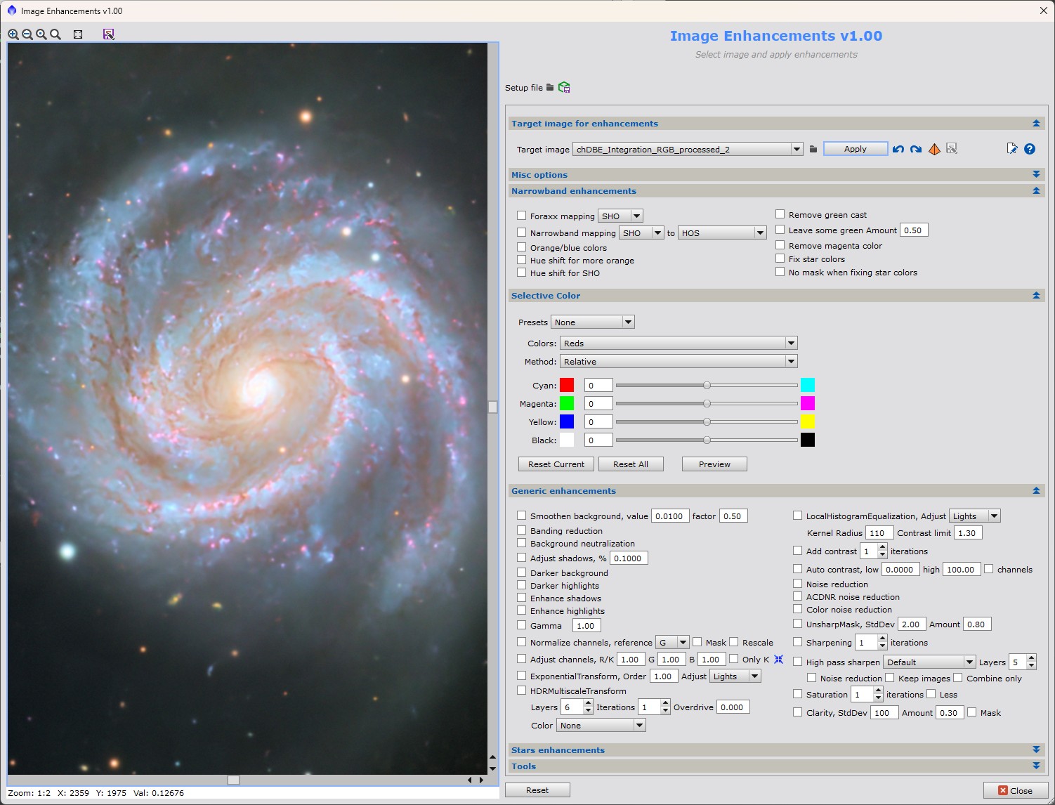- With enhancements options it is possible to do basic enhancements like remove stars using StarNet2 or StarXTerminator, increase contrast, run HDRMultiscaleTransform, LocalHistogramEqualization and make smaller stars automatically.