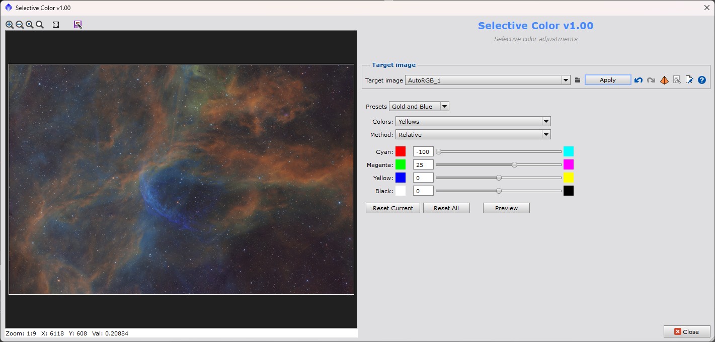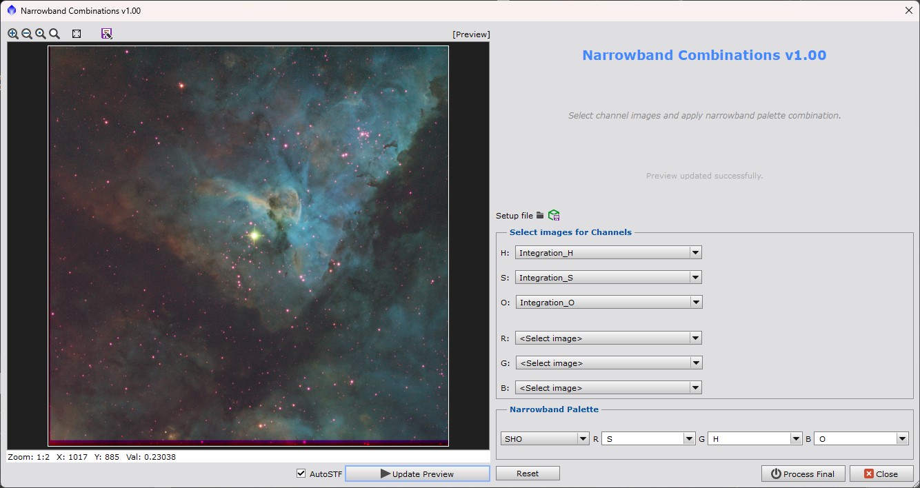 Narrowband colorizing is inspired by Steven Miller's YouTube channel Entering Into Space, NBColourMapper script from Mike Cranfield and Adam Block, and CombineImages script by Dean Carr.