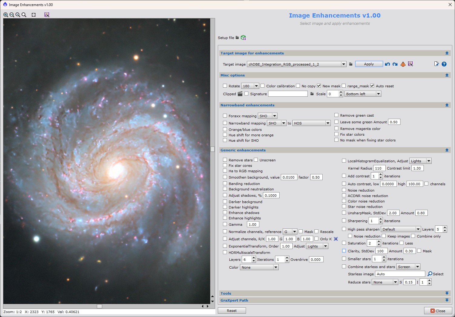 - With enhancements options it is possible to do basic enhancements like remove stars using StarNet2 or StarXTerminator, increase contrast, run HDRMultiscaleTransform, LocalHistogramEqualization and make smaller stars automatically.